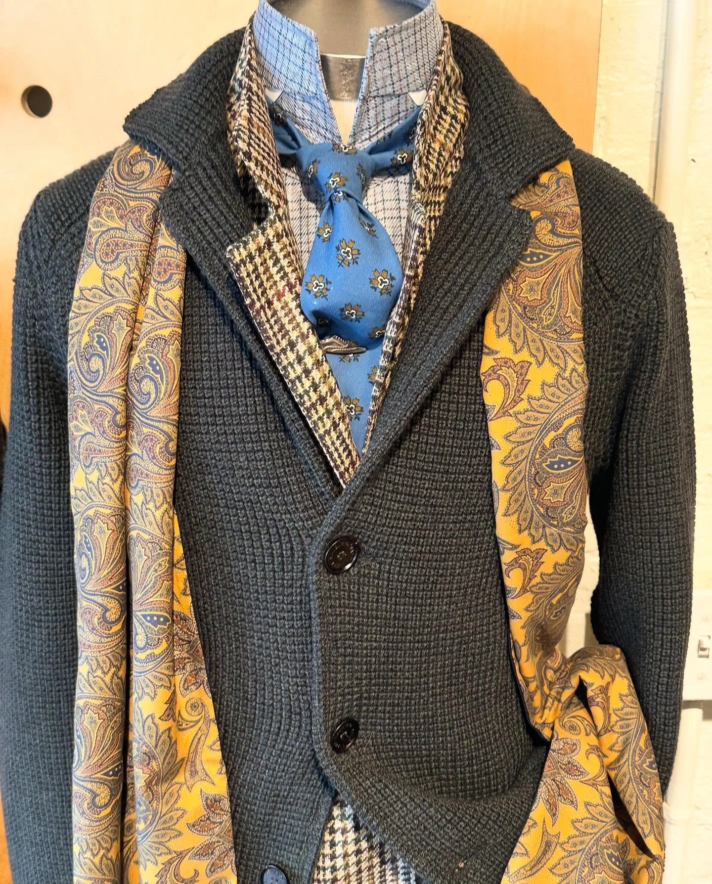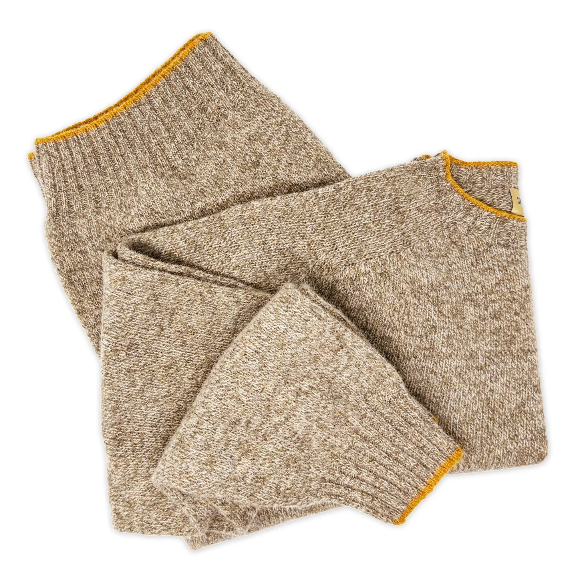 This 100% Shetland wool crew neck sweater in “Pebble” features contrast tipping in “Gold Dust” on the collar, cuffs and waist. Made in Scotland exclusively for DW, it’s currently available in multiple colorways in-store and online at DAVIDWOODSTYLESHOP.COM.