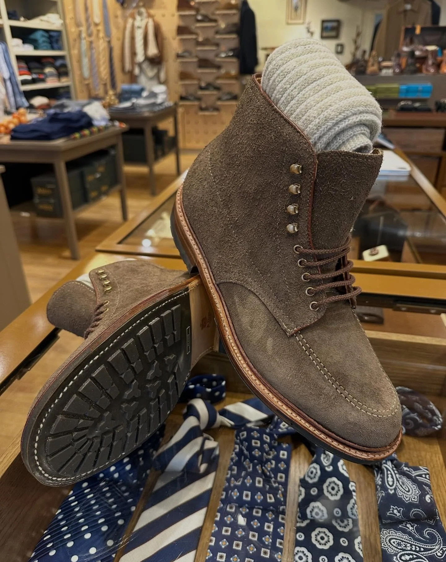 Made in Massachusetts since 1884, Alden is still a family-owned business. This special makeup Indy Boot in reverse earth chamois leather is built on the Trubalance last and features a 360º pre-stitch reverse welt, mahogany edge, tonal eyes and hooks – and Commando sole/heel. Available both in-store at our brick & mortar and online at DAVIDWOODSTYLESHOP.COM. Also, don't forget your Shoe Trees – the best investment to keep your shoes looking good for a long time.